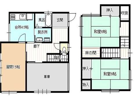 | 詳細間取 | 3DK (1階:洋7.5帖×1、2階:和6帖×2、1階:DK4.5帖) | ||